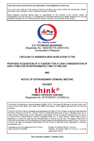 CIRCULAR TO SHAREHOLDER IN RELATION TO THE PROPOSED DISPOSAL OF A MARINE VESSEL, NAMELY NAUTICA MUAR TO PORTLAND VESSELS LTD
